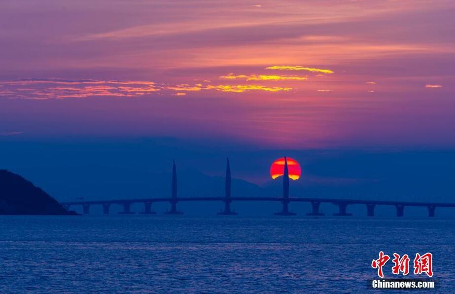 10月22日早晨,从广东珠海市的情侣路向东眺望,一轮红日从东方冉冉升起,将港珠澳大桥映射得格外迷人。“超级工程”港珠澳大桥将于24日上午9时正式通车。中新社记者 张炜 摄