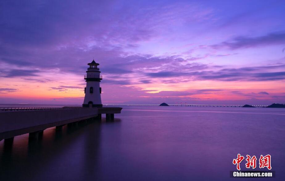 10月22日日出前,从广东珠海的情侣路向东眺望,朝霞满天,将远处的港珠澳大桥映衬得格外美丽。“超级工程”港珠澳大桥将于24日上午9时正式通车。中新社记者 张炜 摄