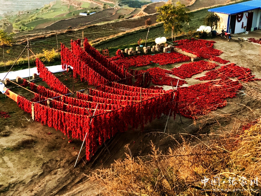 天天天水网讯 据张家川县政府网消息,近日,笔者在马关镇新义梁下乡途中拍到某农业种植合作社的院内,有红红的辣椒挂在架上。院内的主人告诉笔者,他除了种植大片的花椒还种植了一些辣椒。你看这红红的辣椒象征着我们新时代红红火火的日子。