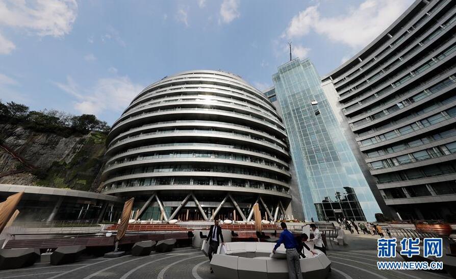 一名工人(右下)在位于酒店顶楼附近的崖壁上施工(11月13日摄)。 位于上海松江的世茂洲际酒店11月15日正式开门营业。这家在一个废弃采石矿坑内建成的酒店成为上海又一新景。 新华社记者 方喆 摄