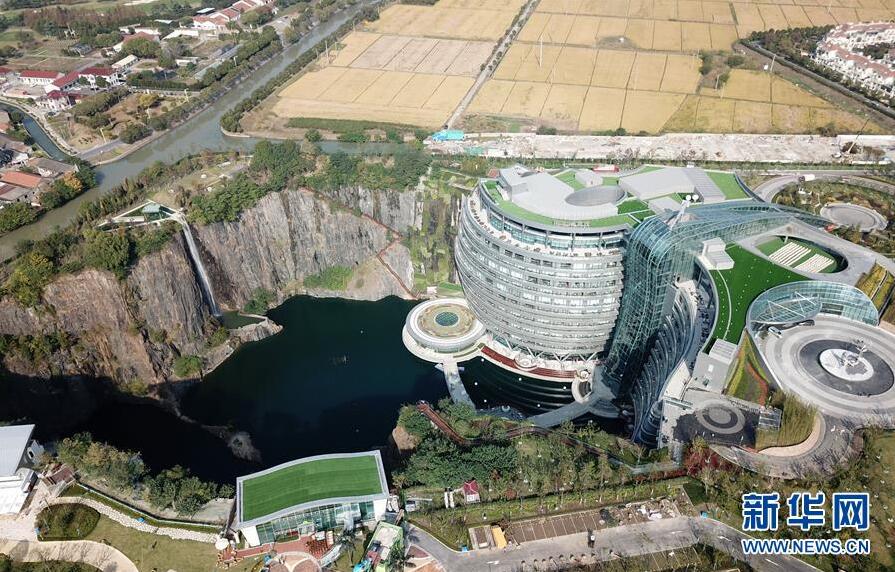 这是位于上海松江佘山脚下的世茂洲际酒店(11月13日无人机拍摄)。 位于上海松江的世茂洲际酒店11月15日正式开门营业。这家在一个废弃采石矿坑内建成的酒店成为上海又一新景。 新华社记者 方喆 摄