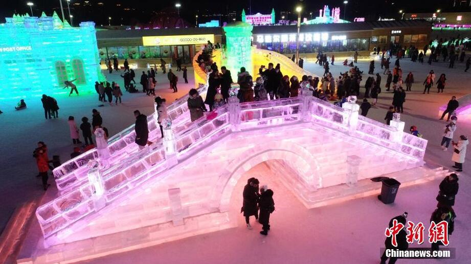 2月14日,哈尔滨冰雪大世界举行“冰雪告白季”活动,众多情侣在冰天雪地中深情告白、相约白首。图为游客参观“情人桥”。中新社记者 吕品 摄