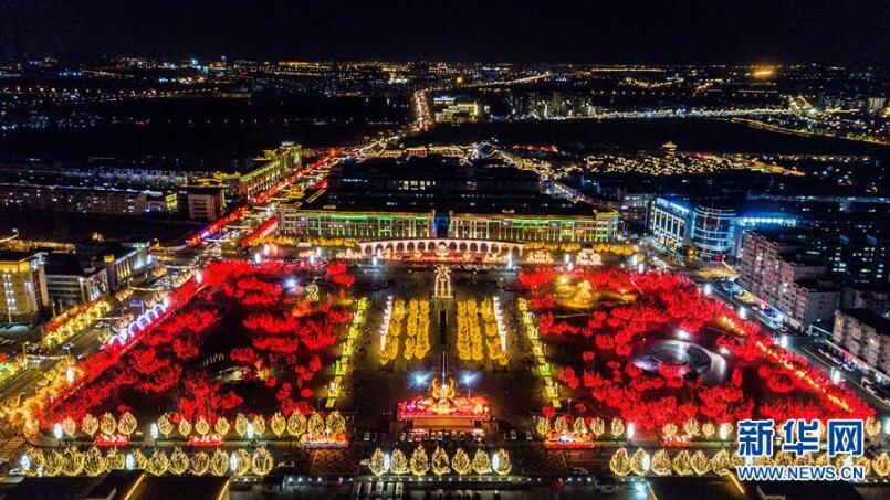 2月16日晚,天津市西青区杨柳青庆元宵大型灯展安装完成并进行试灯(无人机拍摄)。 元宵节临近,各地张灯结彩、火树银花,营造出浓浓的节日氛围。 新华社发(沈岳 摄)