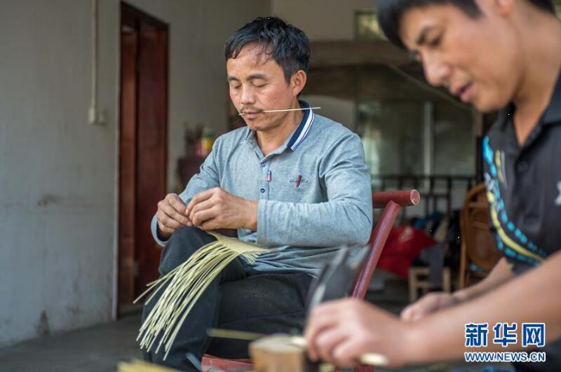 胡廷贤(左)与徒弟胡兵在自家门前编织土家族传统竹编(3月20日摄)。 新华社记者 万志云 摄