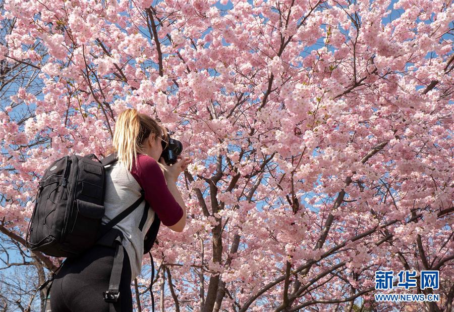 3月22日,在奥地利维也纳,一名女子拍摄盛开的樱花。 新华社/法新