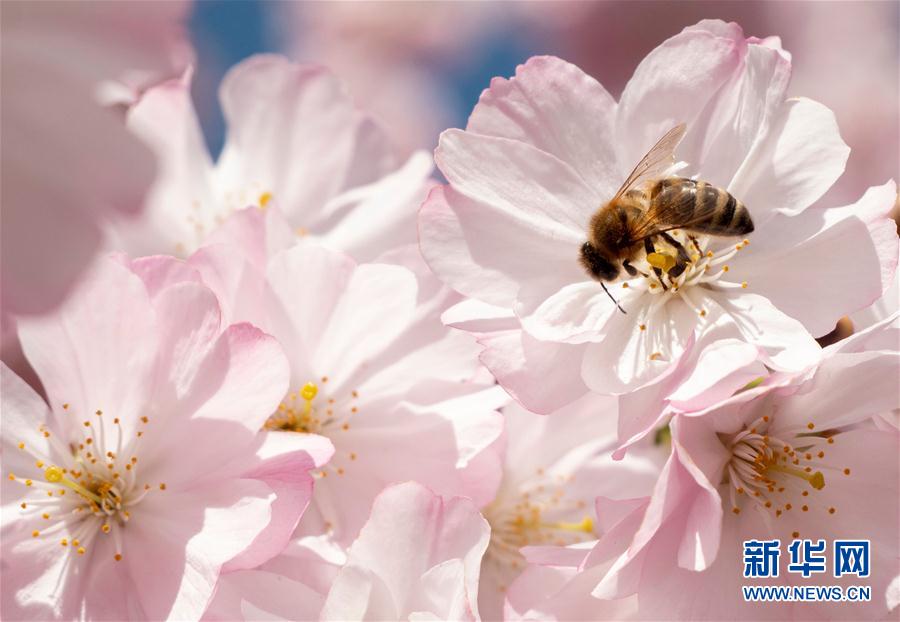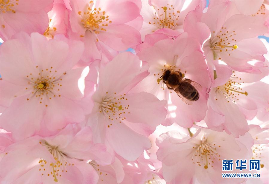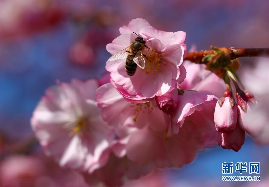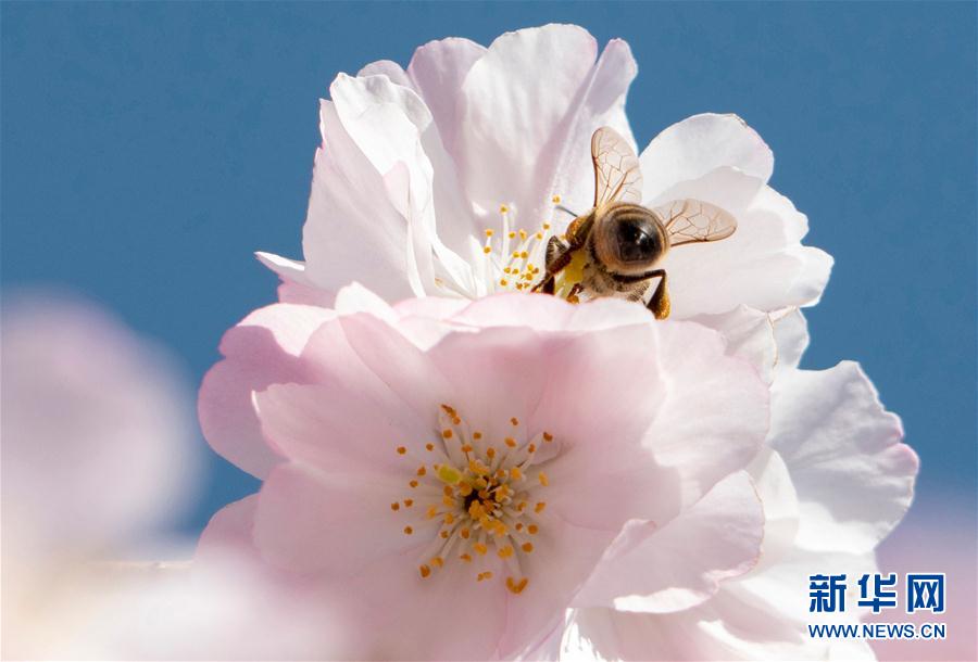 3月22日,在奥地利维也纳,一只蜜蜂在盛开的樱花上停留。 新华社/法新