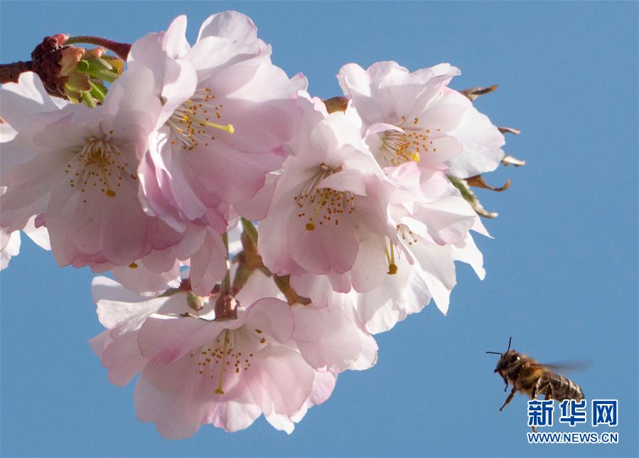 3月22日,在奥地利维也纳,一只蜜蜂在盛开的樱花旁飞舞。 新华社/法新