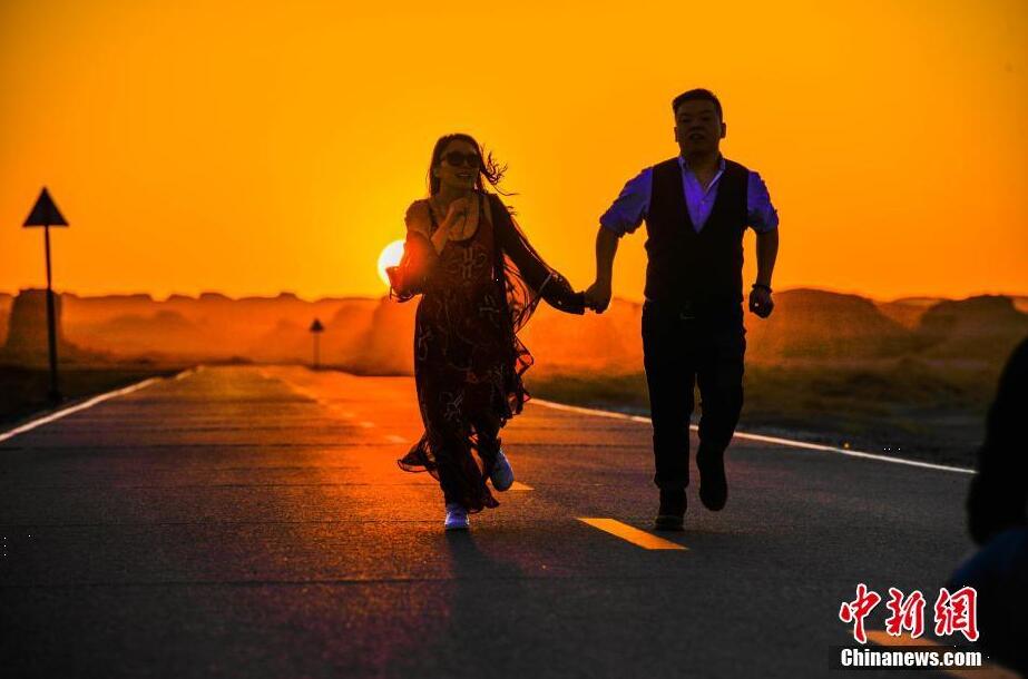 一些摄影爱好者在敦煌雅丹魔鬼城拍摄大片。王斌银 摄