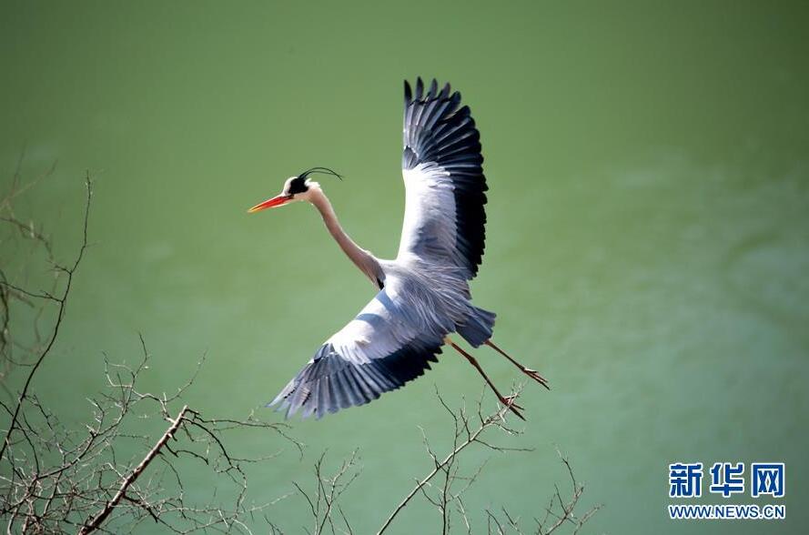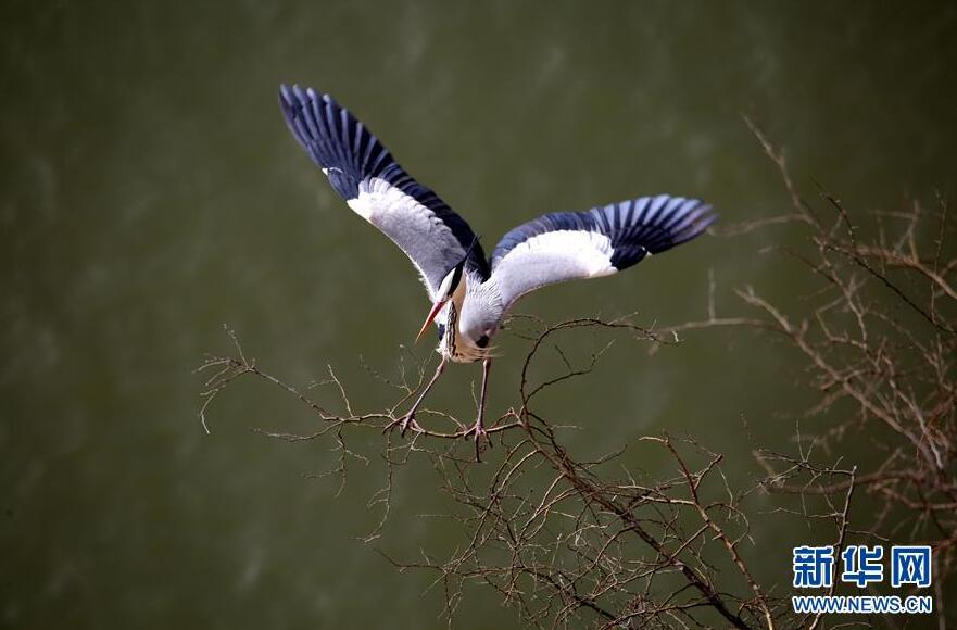 在山西平陆黄河湿地,一只苍鹭停在枝头(4月10日摄)。 连日来,随着气温回暖,数百只苍鹭来到位于山西省南部的平陆县黄河湿地,它们在黄河岸边的崖壁上筑巢安家,形成了春日里一道靓丽的风景线。 新华社发