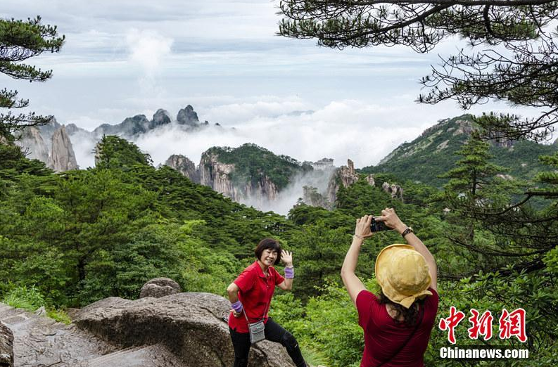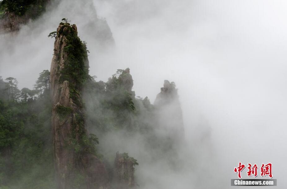 6月25日,安徽黄山风景区经历一场雨水洗礼后,绵延起伏的山峦沉浸在云雾之中,漫山树木青翠欲滴。缕缕云雾在山谷间升腾,时而缠着险峰,时而绕着奇松和怪石,时沉时浮,云舒云卷,黄山宛如一幅灵动的泼墨山水画。文/刘浩 图/叶永清 奇松怪石在云雾之中若隐若现。文/刘浩 图/叶永清 游客以黄山美景中拍照留念。文/刘浩 图/叶永清 云雾聚拢成铺云之海,群峰浸润云海之间。文/刘浩 图/叶永清