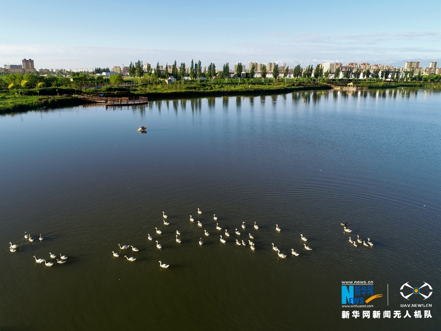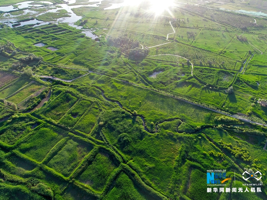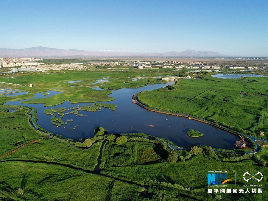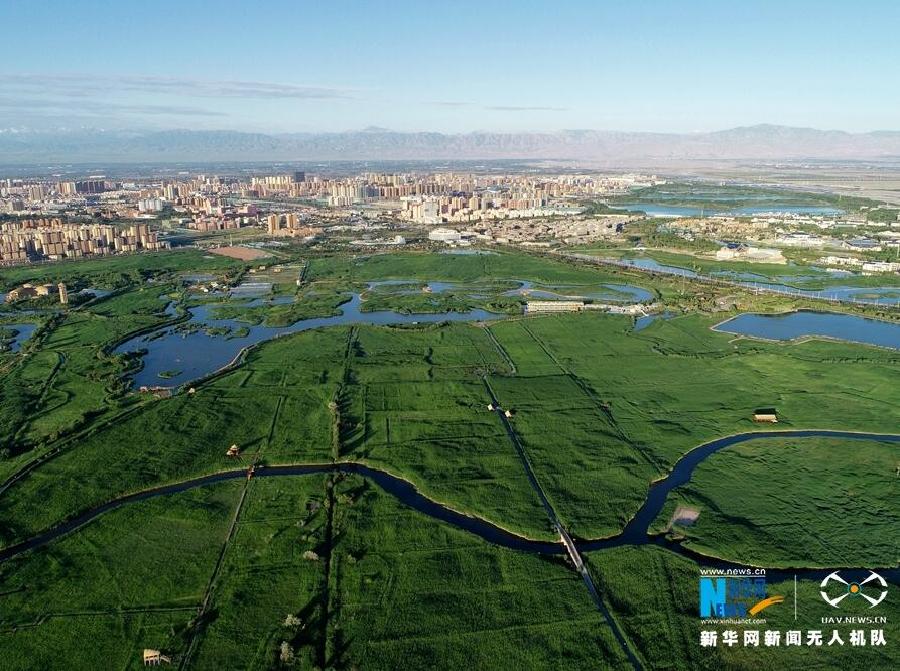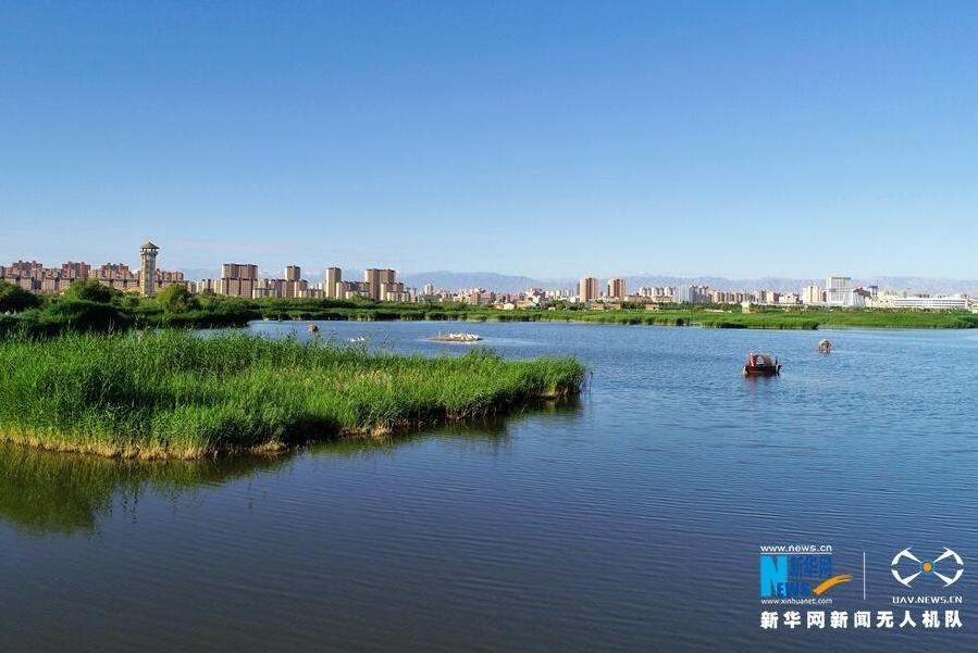 2019年6月30日,无人机航拍的甘肃张掖国家湿地公园盛夏景色。张掖国家湿地公园位于张掖市区北郊,面积2.6万亩,由河流、沼泽、草甸等天然湿地,以及人工湖、池塘、沟渠等人工湿地为主体构成的复合型湿地生态系统,发挥着水源涵养和水资源调蓄、净化水质、维护湿地生物多样性、防止沙漠化和改善区域气候等重要的生态功能。新华网发(成林 摄)