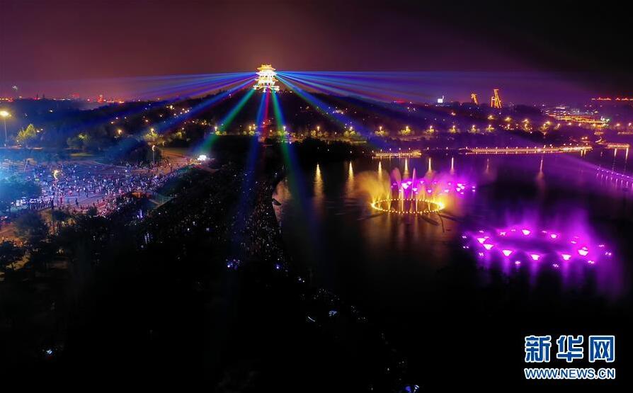 7月10日,观众在唐山南湖景区欣赏灯光水舞秀(无人机拍摄)。 当日,河北省唐山市南湖景区灯光水舞秀项目正式启幕。据介绍,该项目位于南湖景区丹凤朝阳广场南侧龙泉湾湖面,长220米,宽81米,其建设旨在提升南湖景区核心景观品质,发挥城市公共空间功能,丰富群众和游客的文化生活。 新华社记者 杨世尧 摄
