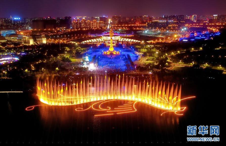 7月10日无人机拍摄的唐山南湖景区灯光水舞秀。 当日,河北省唐山市南湖景区灯光水舞秀项目正式启幕。据介绍,该项目位于南湖景区丹凤朝阳广场南侧龙泉湾湖面,长220米,宽81米,其建设旨在提升南湖景区核心景观品质,发挥城市公共空间功能,丰富群众和游客的文化生活。 新华社记者 杨世尧 摄