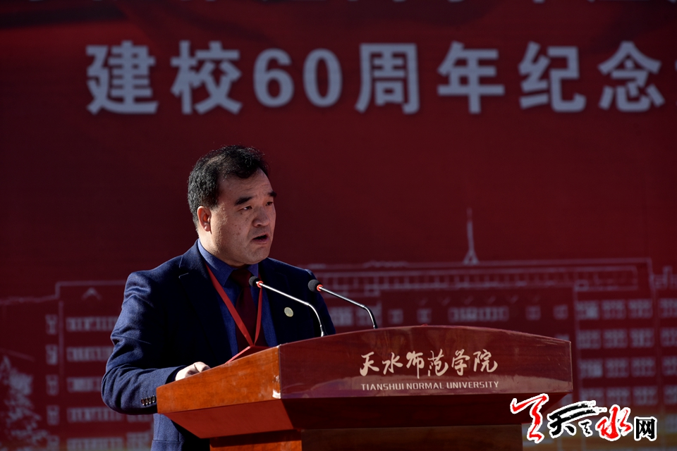 王军代表市四大组织和全市370多万人民向天水师范学院建校60周年表示热烈的祝贺,向全体师生员工及广大校友表示诚挚的问候。他说,60年来,天水与天水师范学院血脉相连,相映生辉,校地双方已经形成了合作发展、水乳交融的良好关系。当前,天水正在抢抓国家“一带一路”、关中平原城市群建设、对接融入成渝经济区等机遇,努力推动高质量发展,决胜全面建成小康社会,加快建设幸福美好新天水和省域副中心城市,希望天水师院进不断提升办学精细化、专业化水平,早日建成西部一流、国内知名、师范特色鲜明的高水平应用型大学的同时,一如既往地关注和支持天水的脱贫攻坚、乡村振兴、文旅融合及产业发展等工作,为推动天水经济社会发展作出新的更大的贡献。他表示,天水市委、市政府将一如既往、义不容辞、更大力度地支持天水师范学院的发展建设,在基础设施、人才引进、科研开发、学科建设、学生创业等方面,为天水师范学院创造更好的环境、提供更优的服务,努力推动大学与城市互利共赢、共同发展。