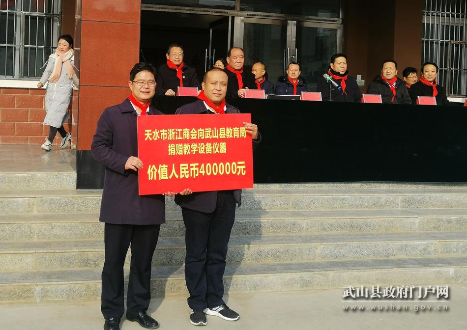 新天水讯 据武山融媒体中心消息, 1月8日,天水市浙江商会为武山县捐赠教学设备仪式在城关镇第五小学举行。市工商联党组书记夏草,市工商联四级调研员、综合科科长杨晖,天水市浙江商会轮执会长张吉,天水市浙江商会副会长付进平、刘斐龙、唐笑航,天水市浙江商会秘书长芦畅;县委常委、统战部部长孙德银,县人大常委会副主任蔡永彦,县政协副主席令录民出席捐赠仪式;县教育局等县直相关单位负责人,城关五小部分师生代表参加捐赠仪式。捐赠仪式由副县长高春霞主持。