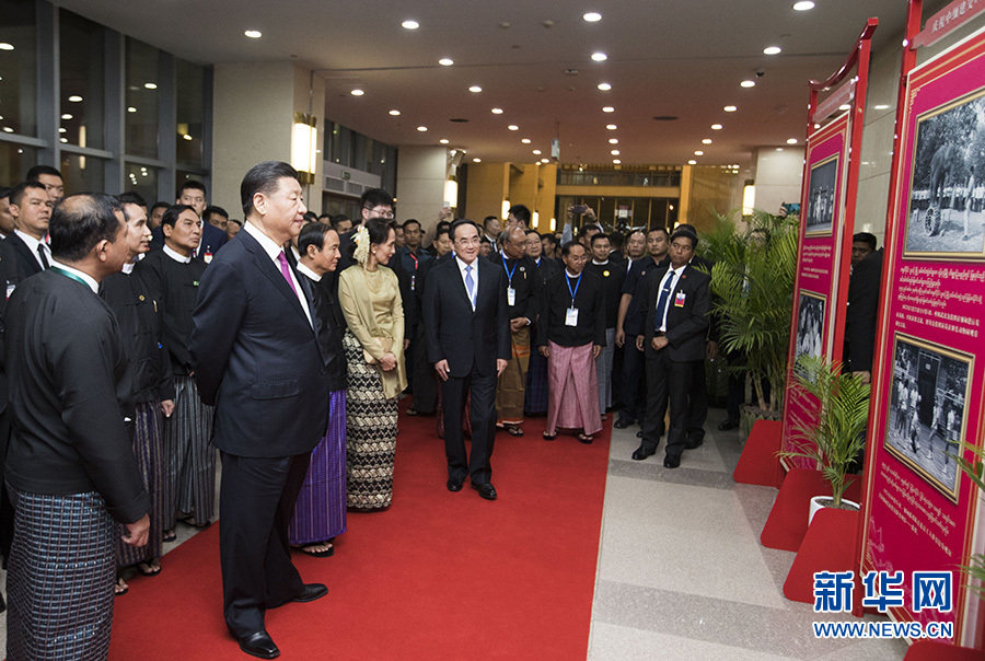 仪式开始前,习近平在缅方领导人陪同下,观看了庆祝中缅建交70周年图片展。图片展记录了中缅建交70年来双方交往中的一幕幕感人画面。习近平不时驻足,认真听取讲解并仔细观看。