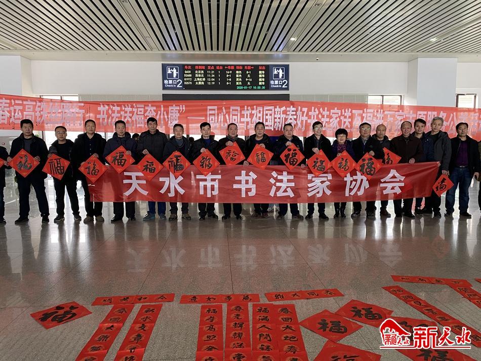 新天水讯 2020年1月17日,由兰州铁路局集团党委宣传部、甘肃省书法家协会主办,兰州铁路局书协和甘肃省铁路沿线各市书协共同承办的2020“同心同书·祖国新春好”公益活动在全省各铁路车站同时举行。