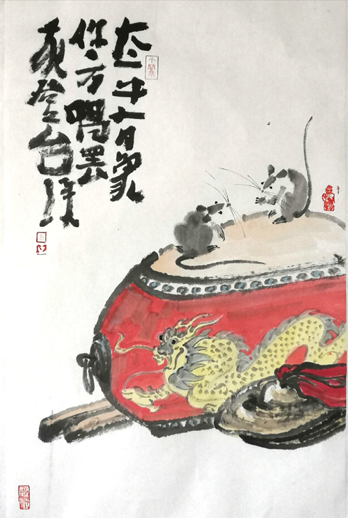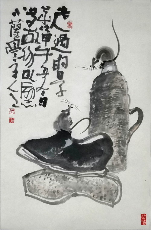 在《丰年》《太平有象》《咬文嚼字》《走过的日子》等作品中,范宏亚把老鼠的机敏伶俐表现得栩栩如生,再次将“老鼠过街人人喊打”的形象艺术化,把它们设置在粮仓、大鼓、大镲、古籍、暖壶、布鞋等物件的周遭,它们丰衣足食后在鼓面、书面、鞋帮、壶嘴上嬉戏,寻觅到了鼠类的舞台,真可谓“你方唱罢我登场”,这种悠闲自得、率性自然的场面,使得作品妙趣横生,耐人寻味。
