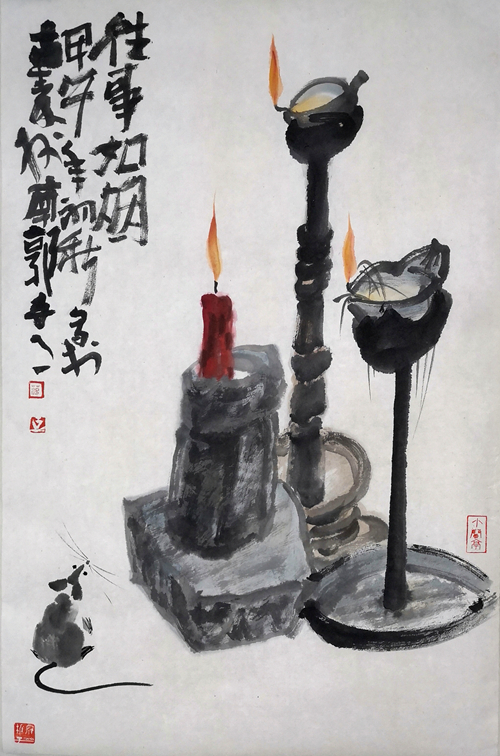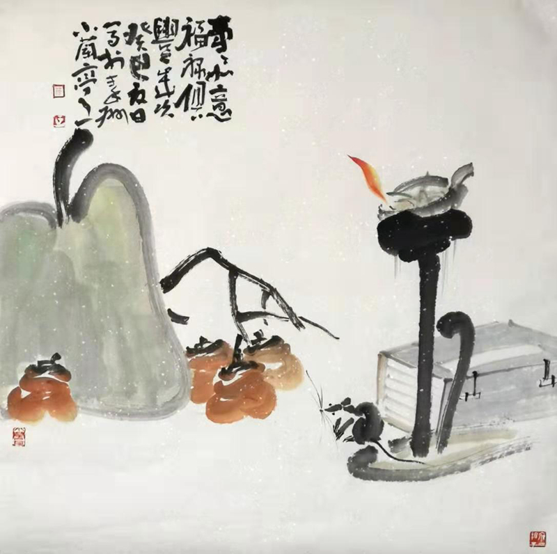 “小老鼠,上灯台,偷油喝,下不来。”这首儿歌在民间传唱不衰,形象地描绘了老鼠天真可爱的一面。范宏亚笔下的《往事如烟》《事事如意》构图简洁,两件作品在画面的油灯下,各有一只老鼠,前者鼠目正视油灯,炯炯有神,偷油喝的欲望不言而喻;后者在微风吹拂的油芯火焰映衬下,似乎在思量着先吃柿子哩还是先偷油喝呢?或者都不是,而是作者借题发挥,笔墨中蕴涵着生活更深的况味,简约干练,显得画面质朴而有趣味。