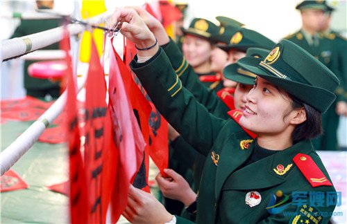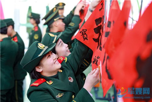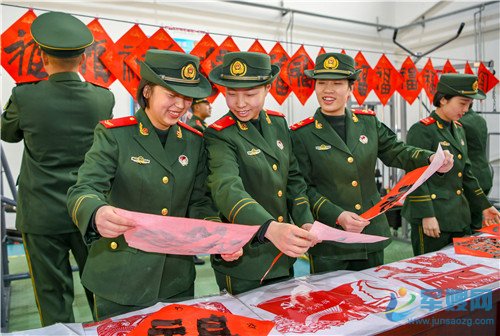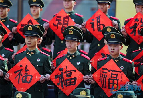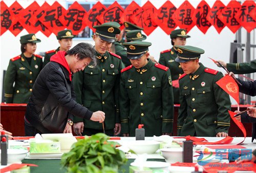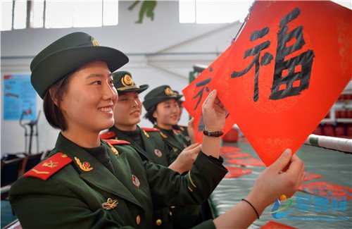 1月20日,官兵展示手中的“福”字。