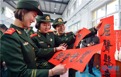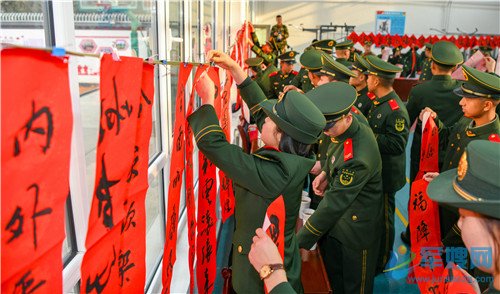 1月20日,官兵展示手中的对联和“福”字。