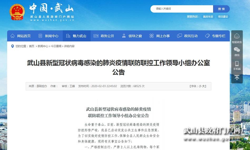 新天水讯 据武山县融媒体中心消息,2月3日22时45分,武山县政府门户网站发布了一条名为《武山县新型冠状病毒感染的肺炎疫情联防联控工作领导小组办公室公告》的信息,随后短短几个小时,该信息点击量突破5万,截止记者发稿前,点击量接近7万,创造了武山县政府网站创建以来单条信息点击量之最,可见网民关注度非常高。