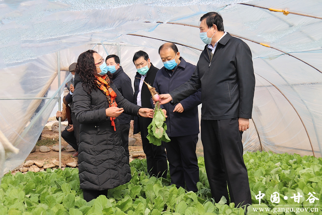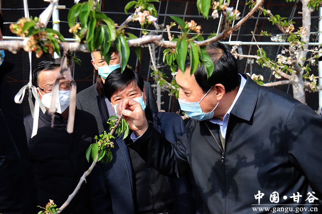随后,赵卫东一行深入到甘谷县早春地膜马铃薯基地、安远镇巩川反季节樱桃示范园果蔬大棚,询问农户果蔬种植、销售和春耕备耕情况,当得知新冠肺炎疫情对蔬菜种植、销售、价格无影响,并能及时春耕备耕时,赵卫东特别高兴,他要求各级各相关部门要全面落实惠农政策,全力做好疫情防控期间春耕农资供应工作,要创新经营服务模式,加强农技培训,强化田间管理指导,引导农民抢抓农时,提高为农服务能力,积极开展春耕备耕生产,为今年农业丰收打好基础。