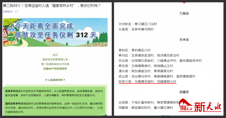 新天水讯 据张家川县融媒体中心消息,近日,国家林业和草原局公布了第二批国家森林乡村名单,甘肃省共有69个行政村获此称号。其中,张家川县马鹿镇花园村、刘堡镇窑儿村2个行政村榜上有名。被认定为国家森林乡村可按照统一标识制作和使用国家森林乡村牌匾。