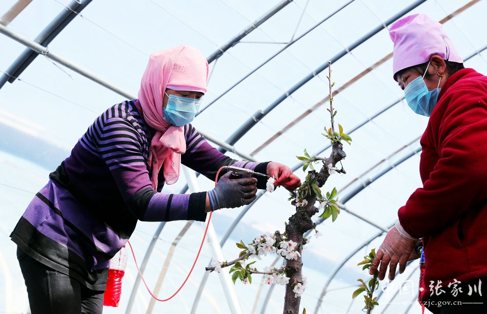 “今年冬春以来,虽然受新冠肺炎疫情影响,樱桃园全面复工的时间比往年稍晚了些,但园子里的活一刻也没耽误。立春过后,我们按照县上和镇上的疫情防控要求,在严格落实每天体温检测、登记报备、消杀防疫、安全防护等措施的基础上,雇了几名工人,分棚分田、短时劳作,提早着手翻耕、整地、覆膜、育苗,确保了防疫、生产两不误。”马河村裕丰果品种植专业合作社负责人县全利介绍。他补充说,“这两天看新闻,疫情每天都有积极变化,一直在向好的方向发展,我们县也成了低风险区。春耕生产正当时,疫情要防,地里的活也要干,趁现在天气好,樱桃花开得旺,合作社正抓紧人工点花授粉,争取一个月后,马河村大樱桃能提早上市……”