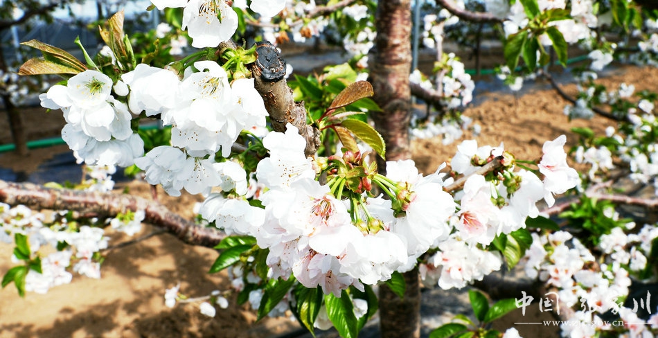 放眼望去,繁花点点的大樱桃棚里,洁白的樱桃花竞相绽放,宛若天女散花、瑞雪飞舞,甚是好看!