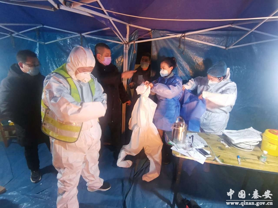 西川镇卫生院院长王自强说:“卫生院按照县上关于疫情防控的要求部署,在第一时间筹备物资,组建队伍,落实各种措施,全体干部职工,尤其是党员向支部递交了请战书。” 310国道口是秦安县的重要交通入口也是疫情防控的重点监测点,西川镇卫生院党支部25名党员干部带头在留验站对过往的车辆进行登记及消杀,对所有进出车辆人员进行体温检测。监测点的工作一站就是5个小时,在上岗前他们不敢喝水,不敢吃饱,因为他们知道防护服脱一次就污染一次,“一站到底”就成了他们这些守护者的口号。