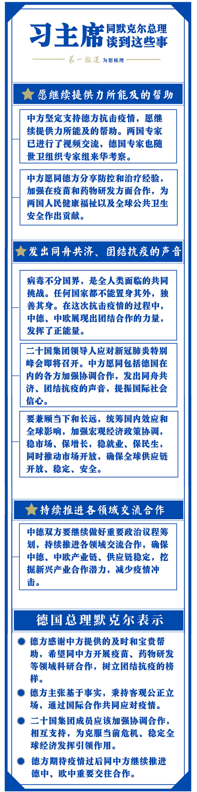 习近平强调,在中国发生新冠肺炎疫情初期,你向中方表达了慰问和支持,德国政府和各界纷纷伸出援手,中国人民铭记在心。目前德国面临疫情严峻挑战,中国人民感同身受。中方坚定支持德方抗击疫情,愿继续提供力所能及的帮助。两国专家已进行了视频交流,德国专家也随世卫组织专家组来华考察。中方愿同德方分享防控和治疗经验,加强在疫苗和药物研发方面合作,为两国人民健康福祉以及全球公共卫生安全作出贡献。祝愿你领导德国人民早日克服疫情!