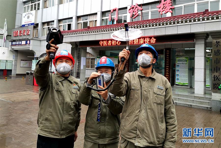 国网湖北孝感供电公司开发区供电中心配电运检班班长沈刚(左一)用红外成像仪检查医院专用供电线路(1月24日摄)。 新华社发 (刘刚 摄)