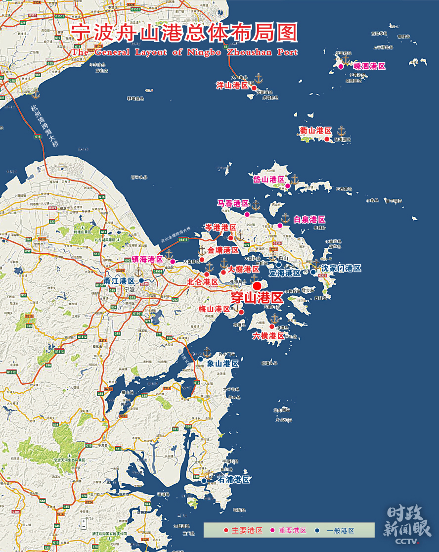 △宁波舟山港由北仑、洋山、六横、衢山、穿山、金塘、大榭、岑港、梅山等19个港区组成。这是宁波舟山港总体布局图。(来源于宁波舟山港股份有限公司官网)