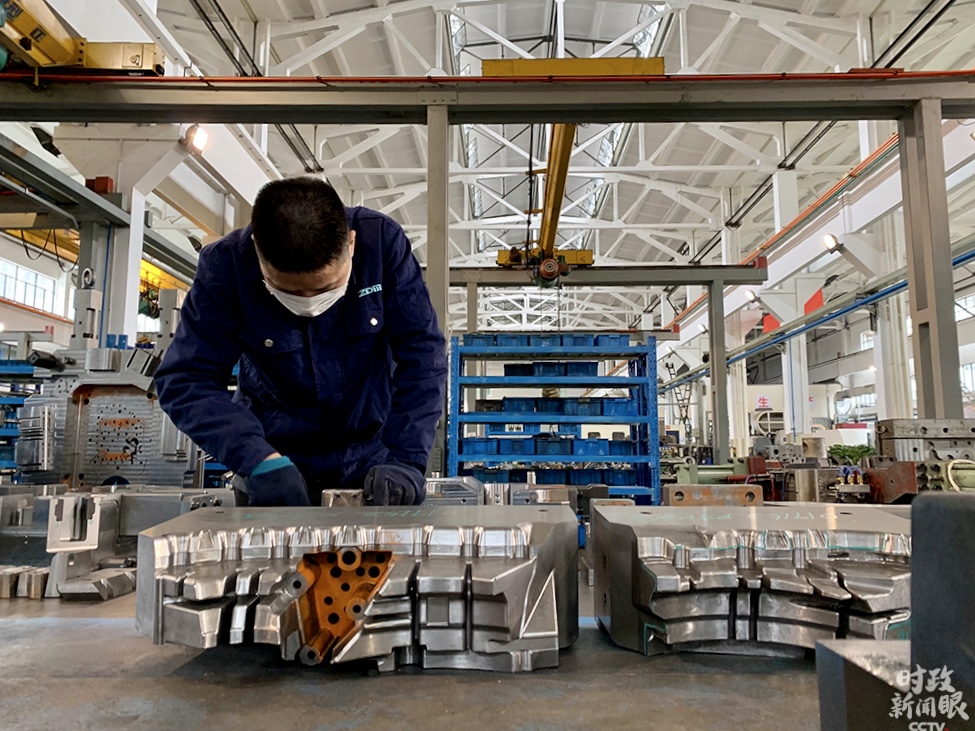 △习近平总书记在宁波臻至机械模具有限公司叮嘱生产线工人,既要保证生产任务,还要保证身体健康。(总台央视记者段德文拍摄)
