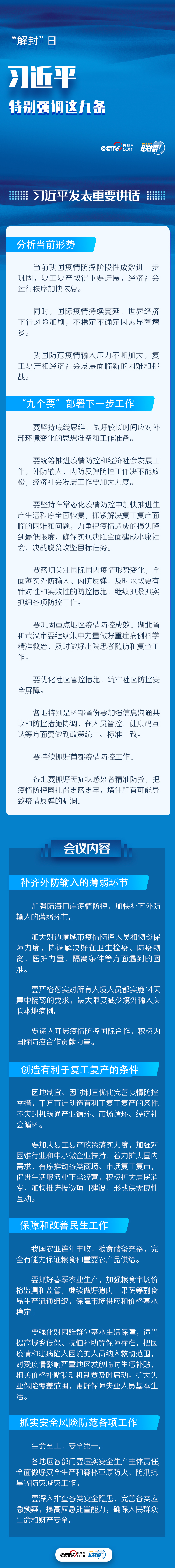 如今,武汉已经“解封”,但“解封”不等于“解防”, “开城门”不等于“开家门”。我国疫情防控阶段性成效进一步巩固,但国际疫情持续蔓延,世界经济下行风险加剧,如何在落实常态化疫情防控举措的同时,全面推进复工复产工作,央视网《联播+》梳理会议要点,与您一起学习。