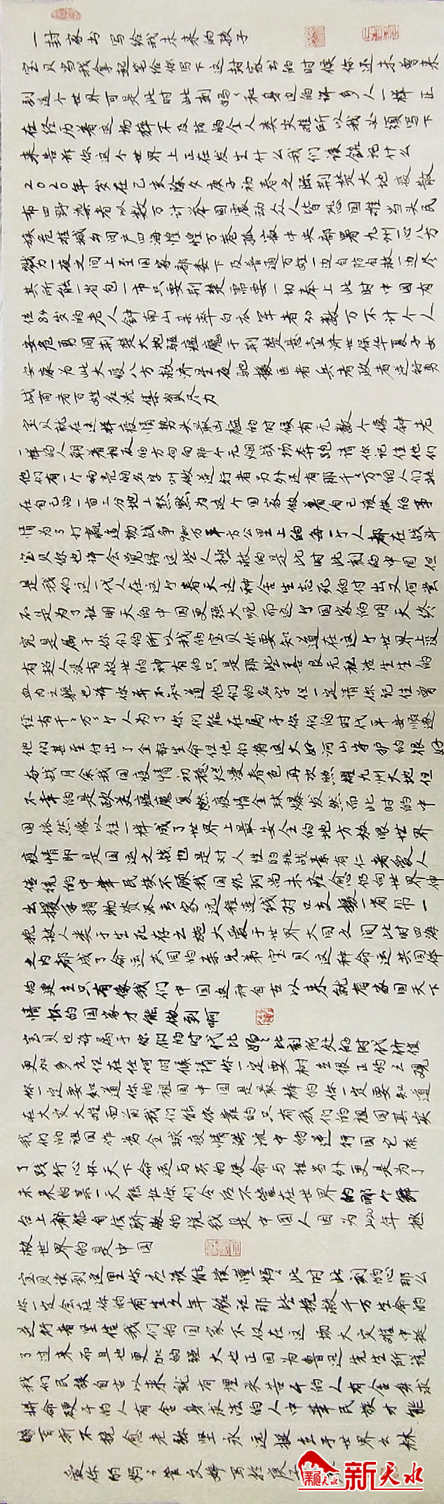 宝贝,也许属于你们的时代,比妈妈此刻所处时代的价值更加多元,但在任何时候请你一定要树立很正的“三观”,你一定要知道你的祖国——中国是最棒的,你一定要知道在大灾大难面前,我们能依靠的,只有我们的祖国。其实,我们的祖国作为全球疫情洪流中的“逆行国”,它除了践行心怀天下、命运与共的使命与担当外,更是为了在未来的某一天,能让你们挺着胸膛做人,能让你们今后不管在世界的哪个舞台上都能自信骄傲的说“我是中国人”!因为,2020年,拯救世界的是中国!