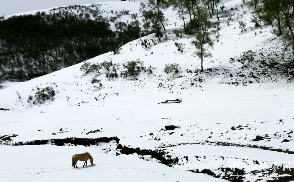 位于张家川县平安乡境内的白石嘴牧场,原本已经染绿的草原一夜之间银装素裹,分外妖娆,宛如一幅水墨画。放眼望去,连绵起伏的高山被白雪覆盖,郁郁葱葱的树木与点点白雪交相辉映,皑皑雪地中,牛马在已经泛绿的草原上吃草,含苞待放的花朵被覆盖,露出“尖尖角 ”,别有一番景致。
