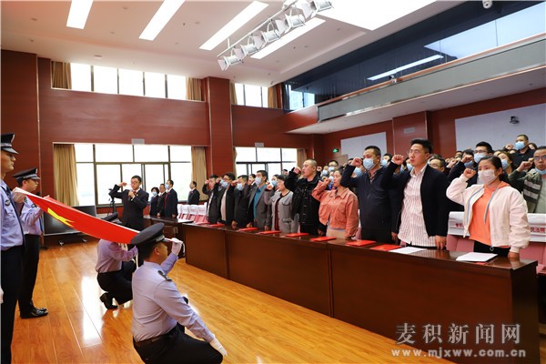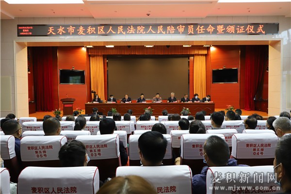 新天水讯 据麦积区融媒体中心消息 “我是中华人民共和国人民陪审员,我宣誓:忠于国家,忠于人民,忠于宪法和法律,依法参加审判活动,忠实履行陪审职责,廉洁诚信,秉公判断,维护社会公平正义!”5月7日下午,天水市麦积区人民法院人民陪审员任命暨颁证仪式在第一审判庭举行,88名人民陪审员面对国旗庄严宣誓。