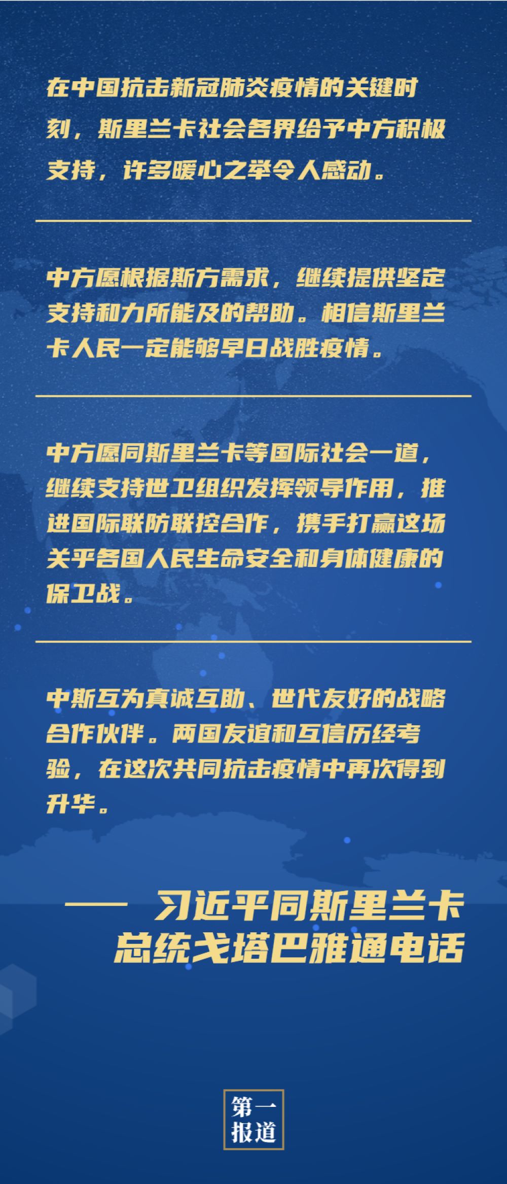 习近平指出,在中国抗击新冠肺炎疫情的关键时刻,斯里兰卡社会各界给予中方积极支持,许多暖心之举令人感动。在你强有力领导下,斯里兰卡有效遏制了疫情扩散蔓延。中方愿根据斯方需求,继续提供坚定支持和力所能及的帮助。相信斯里兰卡人民一定能够早日战胜疫情。感谢斯里兰卡政府和人民在疫情期间对在斯里兰卡的中国公民给予关照。中方将继续保障在华斯里兰卡公民生命安全和身体健康。中方愿同斯里兰卡等国际社会一道,继续支持世卫组织发挥领导作用,推进国际联防联控合作,携手打赢这场关乎各国人民生命安全和身体健康的保卫战。