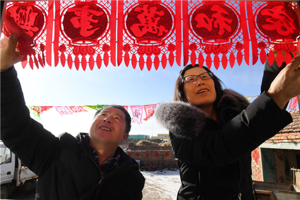 在河北省张北县德胜村,徐海成(左)和妻子裴秀平在家中布置春节装饰(2018年2月9日摄)。新华社记者 牟宇 摄