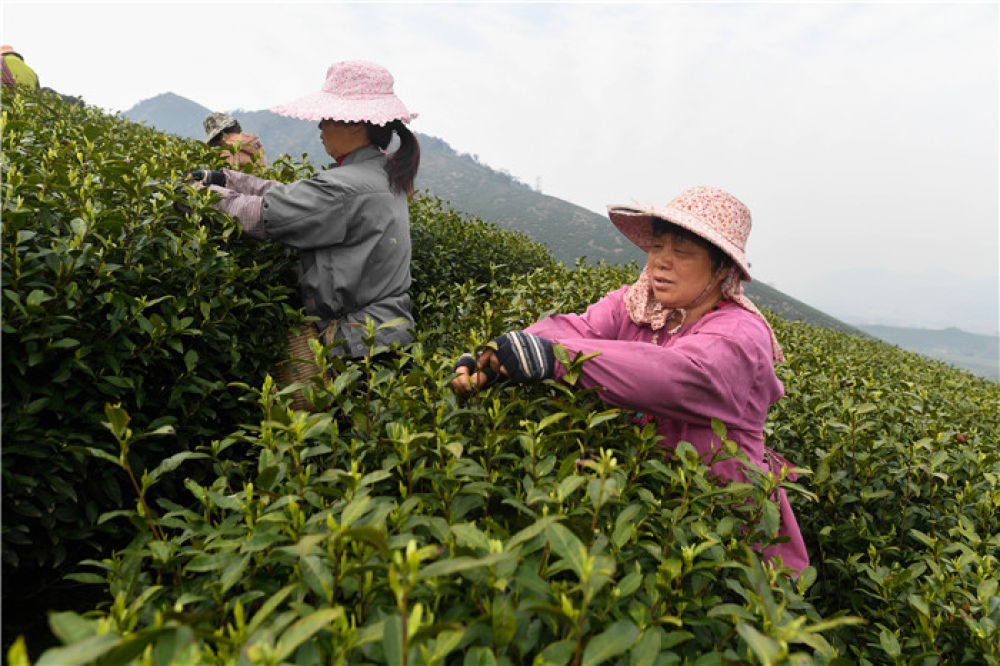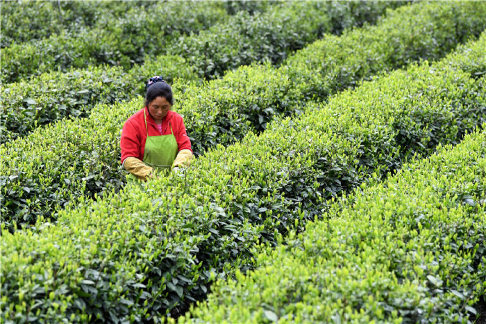 合作社社员在福建省寿宁县下党乡下党村采茶(2020年4月9日摄)。新华社记者 林善传 摄