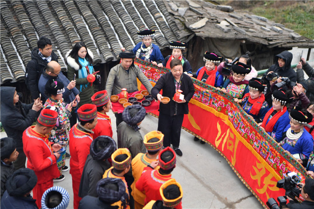 在湖南省花垣县十八洞村,新郎的迎亲队伍遇上新娘亲友“拦门”(2018年2月4日摄)。新华社记者 薛宇舸 摄