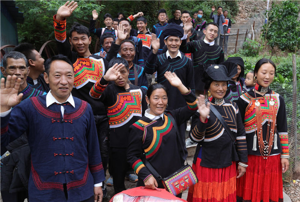 “悬崖村”搬新家的村民在山下公路边合影留念(5月12日摄)。新华社记者 江宏景 摄