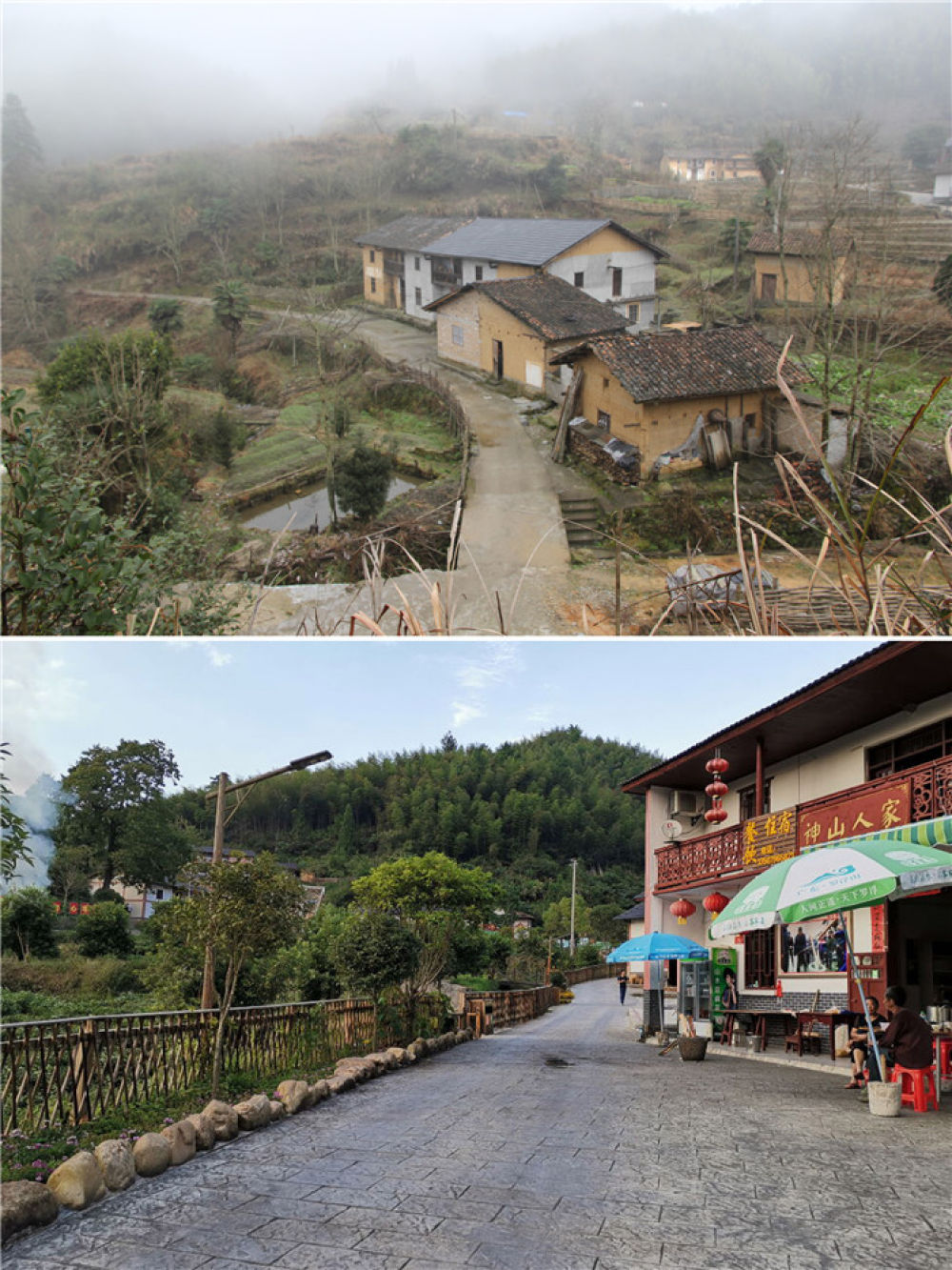 拼版照片:上图为脱贫前的江西井冈山神山村一角(2016年1月摄);下图为2019年9月拍摄的江西井冈山神山村一角。新华社发