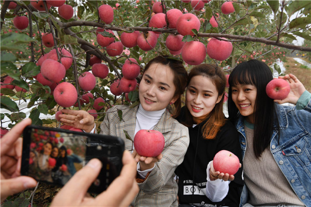 游客在陕西省延安市志丹县双河镇李家湾村果园拍照留影(2019年10月22日摄)。新华社记者 陶明 摄