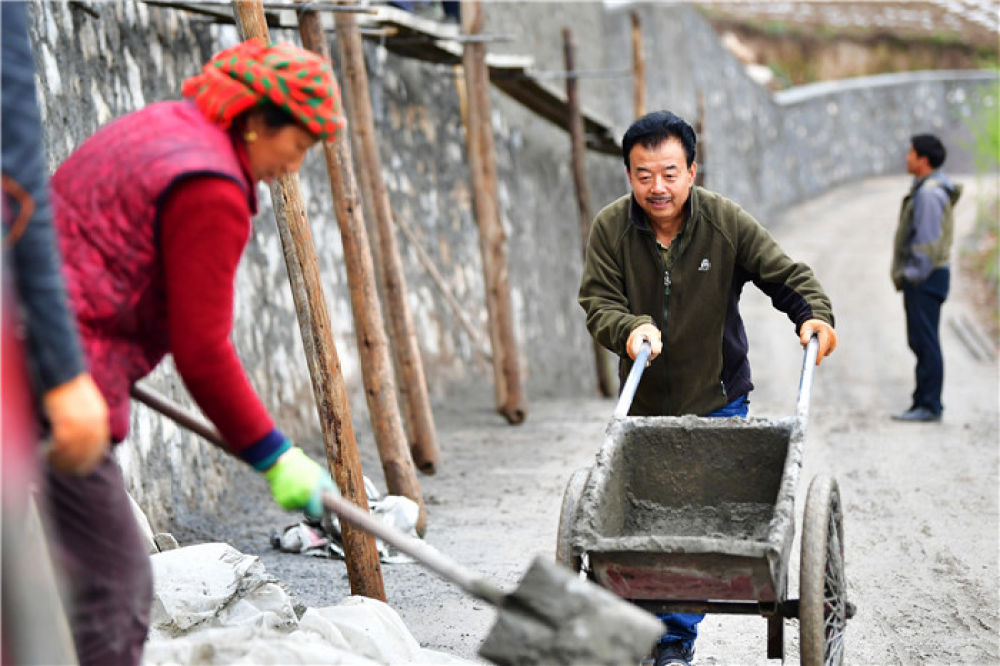 甘肃省甘南藏族自治州舟曲县果耶镇勒阿村驻村第一书记张金利(右)和村民一起修建入村道路的护坡(2020年4月22日摄)。新华社记者 陈斌 摄