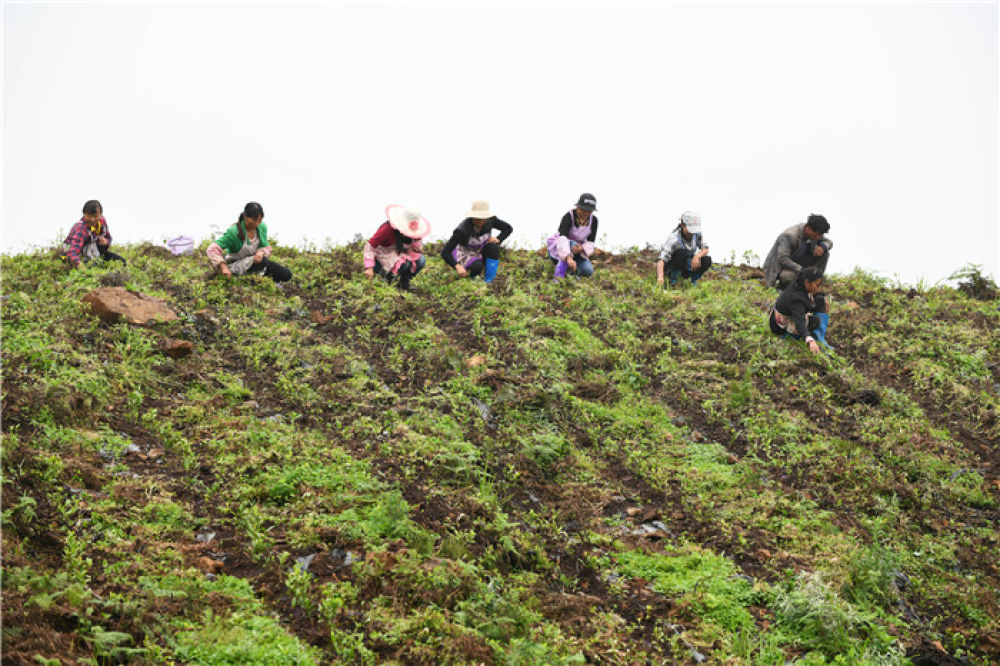 农民在贵州省普安县地瓜镇屯上村的“扶贫茶园”里给茶苗除草(2019年7月7日摄)。当地的茶园栽种有浙江安吉黄杜村捐赠的白茶苗。新华社记者 杨文斌 摄