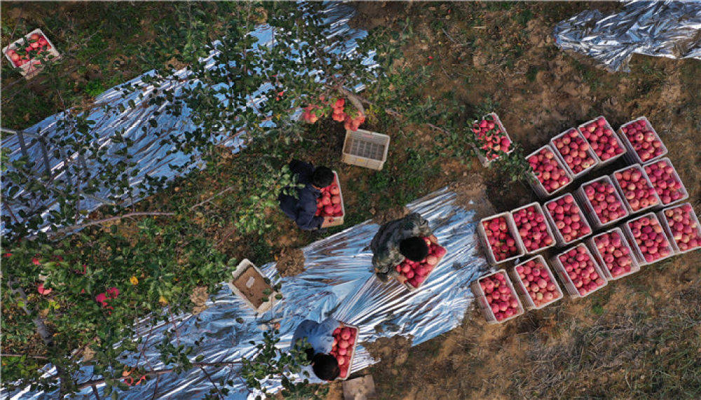 陕西省延安市志丹县双河镇李家湾村村民在果园采摘苹果(2019年10月22日摄,无人机照片)。新华社记者 陶明 摄