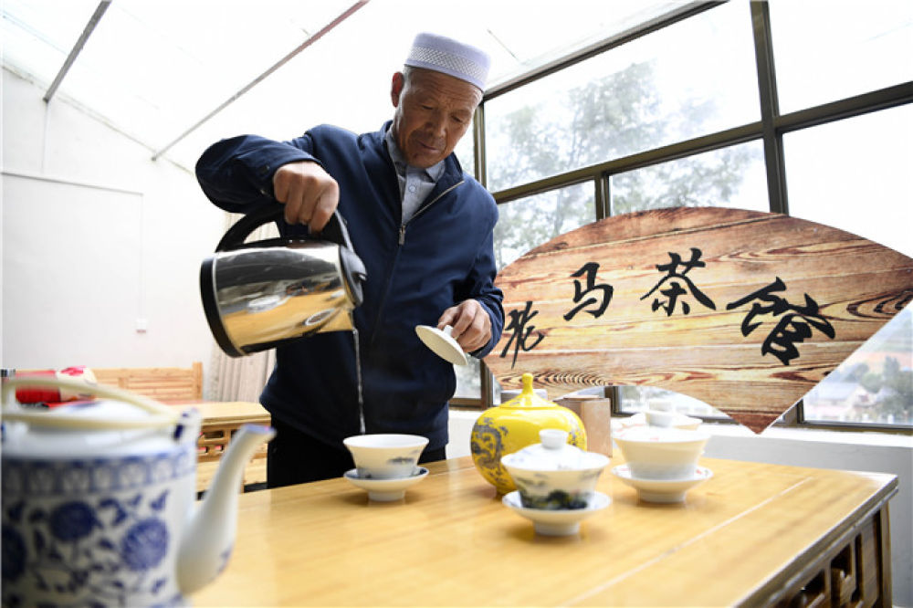 在宁夏固原杨岭村,村民马克俊在茶馆展示茶艺(2018年8月26日摄)。新华社记者 王鹏 摄